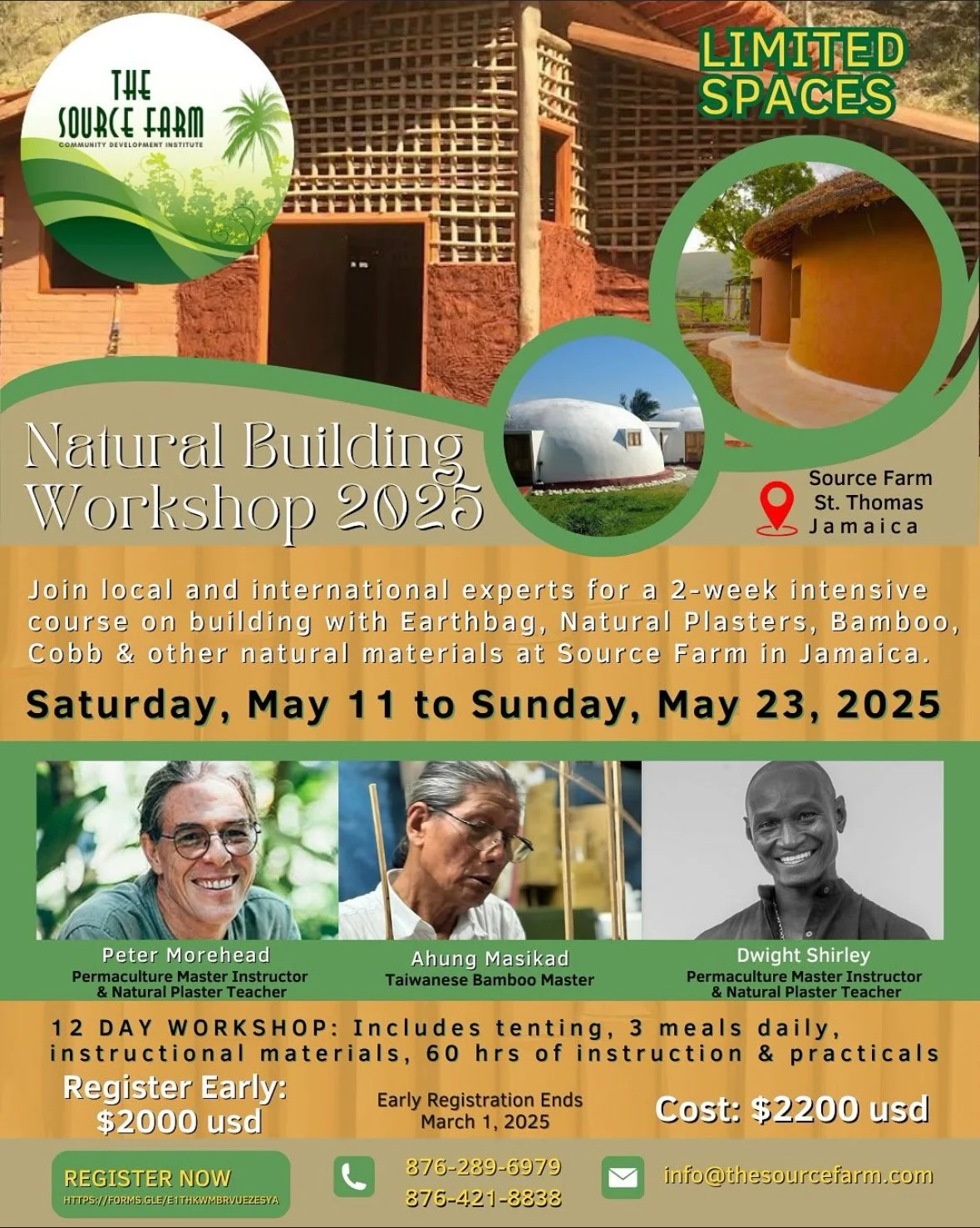 Join local and international experts for a 2-week intensive course on building with Earthbag, Natural Plasters, Bamboo, Cobb & other natural materials at Source Farm in Jamaica.